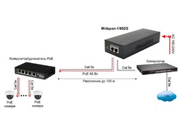 Midspan-1/652G PoE-инжектор 65W Gigabit Ethernet на 1 порт. Соответствует стандартам PoE IEEE 802.3af/at/bt. Автоматическое определение PoE устройств. Мощность PoE на пор ...