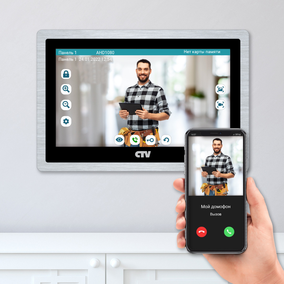 Монитор видеодомофона с 10" сенсорным дисплеем, поддержкой формата AHD и записью в Full HD. С удаленным доступом со смартфона через приложение CTV Home.