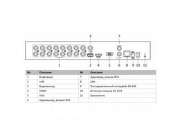 Видеовход: 4 канала BNC; Аудиовход: 1 канал RCA; Видеовыход: 1 VGA и 1 HDMI до 1080Р; Аудиовыход: 1 канал RCA; видеосжатие H.265 Pro/H.265/H.265+/H.264/H.264+; аудиосжатие G.711u.,