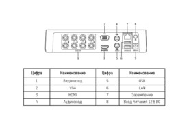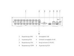 Видеовход: 8 каналов BNC; Аудиовход: 1 канал RCA; Видеовыход: 1 VGA и 1 HDMI до 1080Р; Аудиовыход; 1 канал RCA; видеосжатие H.265 Pro/H.265/H.265+/H.264/H.264+; аудиосжатие G.711u.