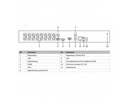 Видеовход: 16 каналов BNC; Аудиовход: 16 каналов; Видеовыход: 1 VGA до 2К, 1 HDMI до 4К; Аудиовыход; 1 канал RCA; видеосжатие H.265 Pro/H.265/H.265+/H.264/H.264+; аудиосжатие G.711u. о