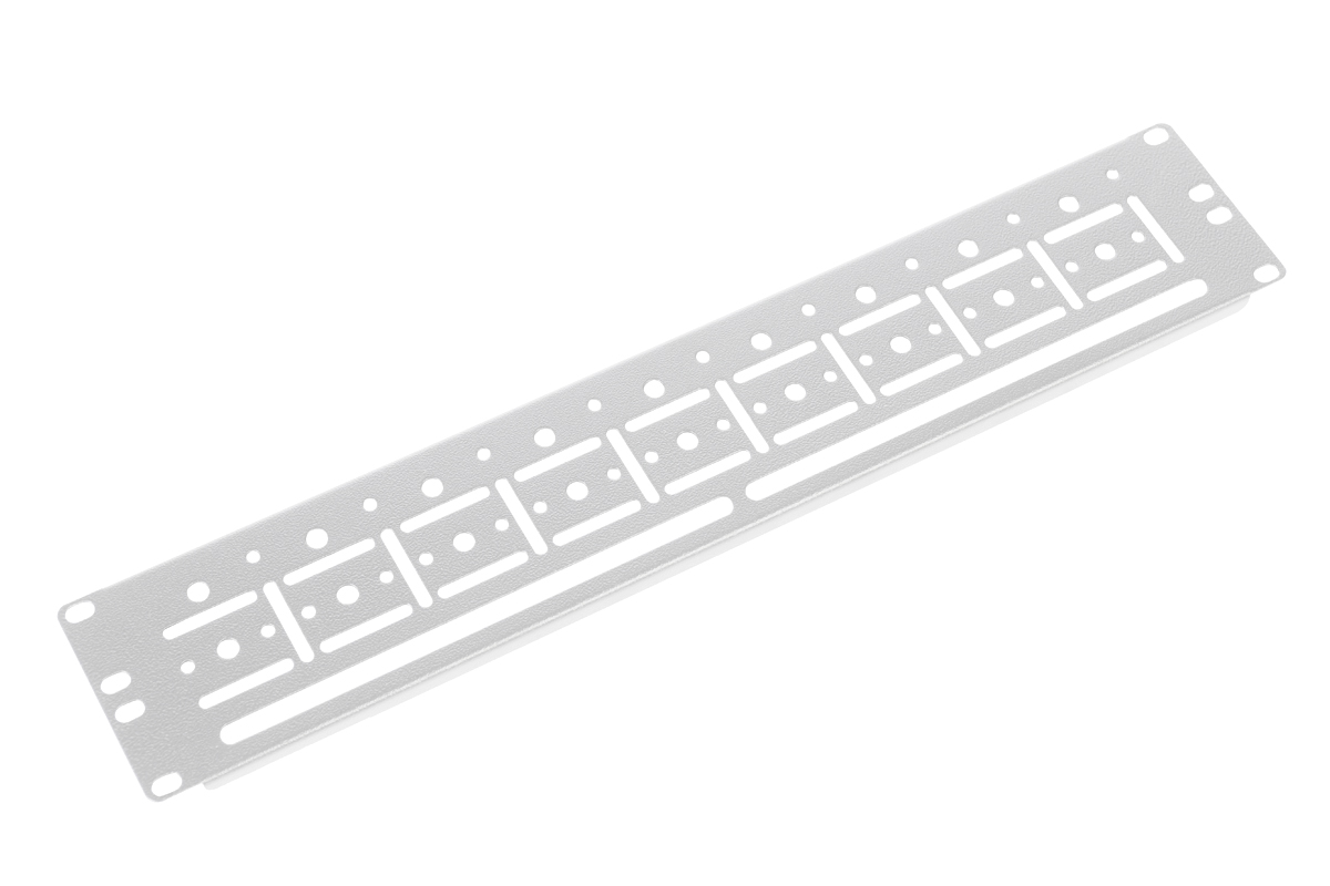 ГКО-У выполнен из металлической панели высотой 2U. Имеет развитую перфорацию для крепления кабеля стяжками. Имеет порошково-полимерное покрытие серого цвета.