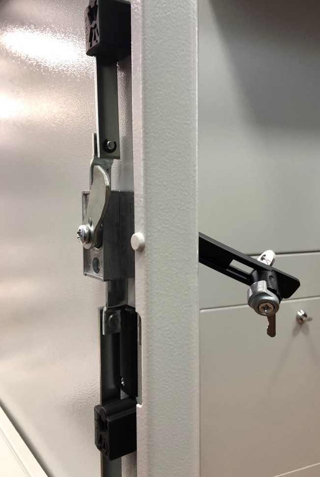 Двери шкафов серии ШТВ-Н имеют перфорацию, которая при необходимости обеспечивает вентиляцию установленного в них оборудования, но при этом исключает прямой доступ в полость шкафа и попадание в него инородных предметов. В двери предусмотрена система вентиляции, закрытая заглушками, при необходимости вместо заглушек можно установить вентиляторный модуль и фильтр. Максимальный угол открытия двери шкафа 120°. На кронштейне, расположенном на верхней петле двери, находится датчик открытия дверей. Cтепени защиты, обеспечиваемой оболочками от наружного механического удара - IK 10.
